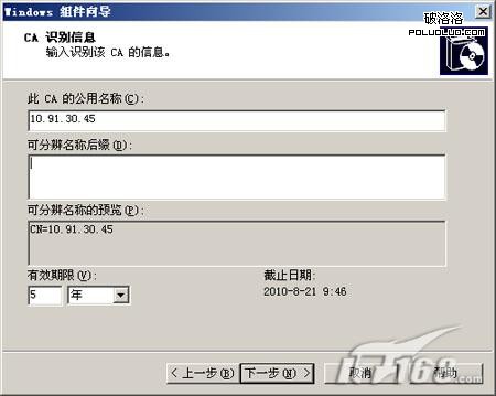 第六步:CA識(shí)別信息處的CA公用名稱輸入本地計(jì)算機(jī)的IP地址,如10.91.30.45,其他設(shè)置保留默認(rèn)信息即可。(如圖5)