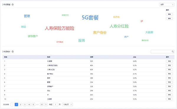 通過AI大數據分析策略,自動篩選并統計近期出現較為頻繁的熱詞,并展示熱詞出現的頻次及占比。