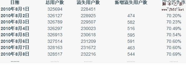 首先需要明確的是用戶的流失可能并不是永久的,也許用戶在一段時間內對網站確實沒有任何需求,那么他會遠離網站一段比較長的時間;或者流失用戶也會因為網站的某次營銷或者網站質量的改善而重新回來。網站總的流失用戶數的計算比較簡單,以超過1個月內登錄即為流失為例,那么總流失用戶數就是所有“當前時間點-用戶最近一次時間點》1個月”的用戶數量。但是單純的總流失用戶數量對于分析是沒有意義的,因為大部分情況下這個數值是一直遞增的,我們需要計算總流失用戶數占總用戶數的比例及新增流失用戶數,觀察它們的變化趨勢,如下表: