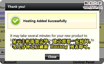 之后如下圖所示,賬戶建立中,點(diǎn)擊 Close 按鈕,刷新 Hosting 列表,即可看到建立的空間,沒(méi)有的話耐心等幾分鐘。