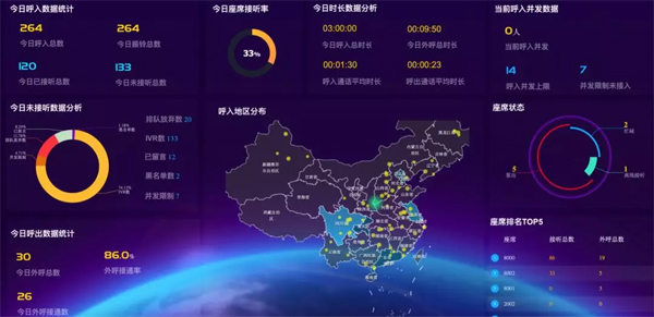 容聯七陌大屏監控能將SAA吉諾服務過程中產生的多維度數據進行整合,接聽率、座席狀態、未接聽、呼入地區分布、并發數據等數據進行可視化分析展示,實現對平臺智能化監控預警和調度監控。