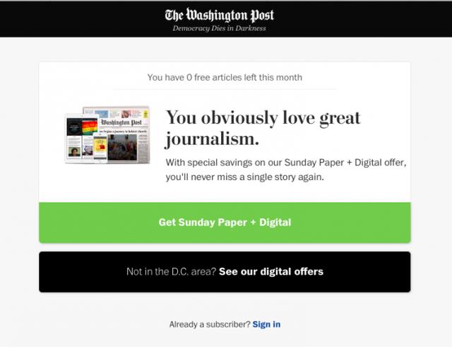《華盛頓郵報》使用稀缺效應提醒讀者,如果不訂閱就會錯過精彩內容