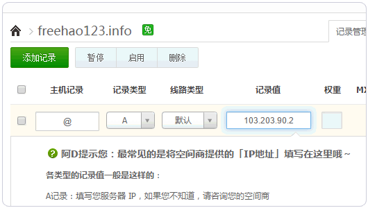 3、修改域名的DNS很簡單,到你的域名DNS管理處刪除原來的A記錄,設置新的Kloudsec 的A記錄即可。