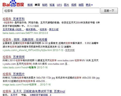 上圖是筆者搜索相關關鍵詞后的搜索結果頁面,細心的你可能會發現排在前面五個的網站中根本沒有相關行業的企業站點,取而代之的是五月天新出的專輯中的一首歌。那么為何搜索結果中沒有相關的企業站點而是一首流行歌曲的信息了。其實如果你仔細研究一下“垃圾車”這個關鍵詞之后你就會發現這個詞在五月天推出這首歌之前搜索量并不高,也就是說現在很多搜索這個詞的人的需求還是五月天的歌曲,而不是相關的企業。