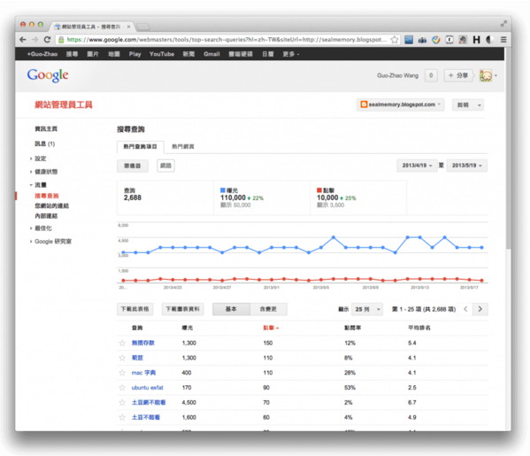 Google 網站管理員是一個專門提供給一般網站或部落格管理員的檢測工具,使用這個工具可以查詢自己的網站或部落格在 Google 搜尋引擎中的狀況,例如網站曝光次數、點擊次數、點閱率與網站在搜尋結果中的平均排名等。