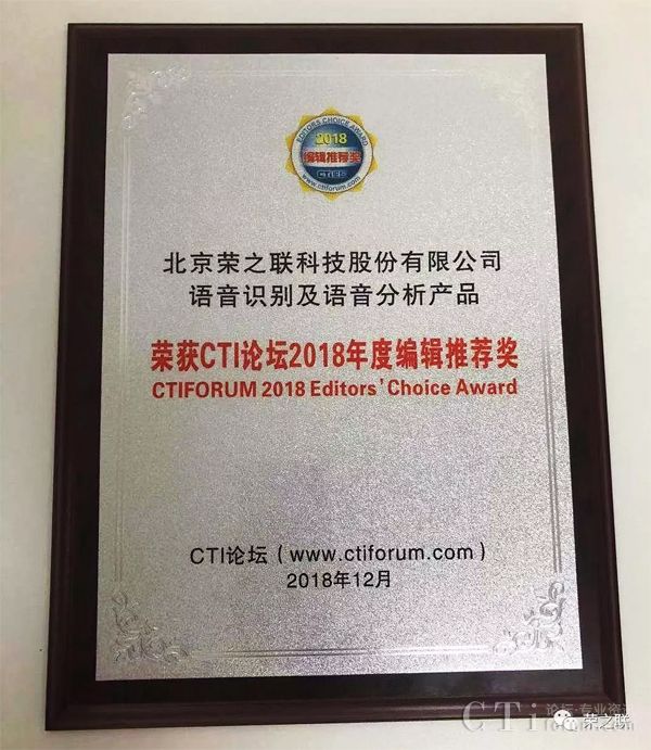 榮之聯(lián)榮獲“2018年度CTI論壇編輯推薦獎(語音識別及語音分析產(chǎn)品類)”