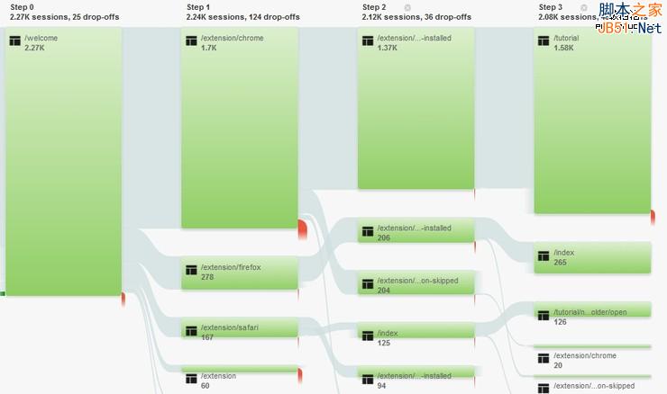 另外一個強大的報告是漏斗可視化,在這里你能夠在同一個界面內看到所有漏斗的表現——報告還會展示每一個步驟有效程度,以及用戶如果在某一個步驟離開你的漏斗將會前往何處。