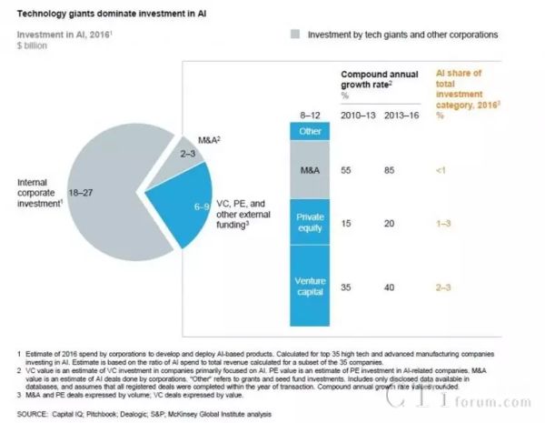 百度、谷歌等科技巨頭2016年在AI上的總投入是200億-300億美元,這些資金中90%用于研發(fā)和部署,10%用于收購。從2013年起,對AI的投資增長率就是其他行業(yè)3倍。麥肯錫發(fā)現(xiàn),在接觸到AI技術(shù)的公司中,有20%是早期使用者(earlyadopter),主要集中在高科技/電信、汽車/裝配和金融服務(wù)業(yè)。下圖是麥肯錫分析出來的趨勢。