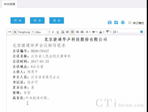 在各類會議的文字直播中,新升級的靈云語音識別能更加實時、高效地將會議情況進行文字轉播,從而達到同步轉寫的效果,庭審記錄中將庭審現場實時記錄轉寫下來,大幅減輕速記員等文字工作者的工作量,提升了信息的傳播效率。