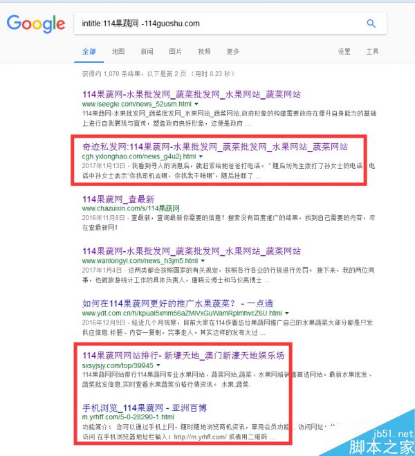 這個命令是,查找含有標題是“114果蔬網”的網頁,除去114guoshu.com 本身。如下圖:
