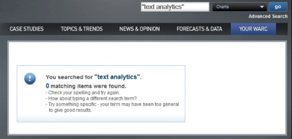 這個問題在當一個既有的范圍限制被默認應用于新的搜索請求時會變得更加復雜(譯者注:比如天貓進入某一店鋪后搜索框的“搜索本店”和“搜索全部”的差別,想象一下如果現在只有“搜索本店”會是個怎樣的體驗)。比如在WARC網站上的“文字分析”類別里搜索“圖表”會出現零結果,但同樣的請求在“所有類別”里是會返還結果的。在所有情況下,特別是當搜索的結果為零時,最好的方案就是采用全局搜索,并在結果中明確地顯示當前搜索的范圍是什么。