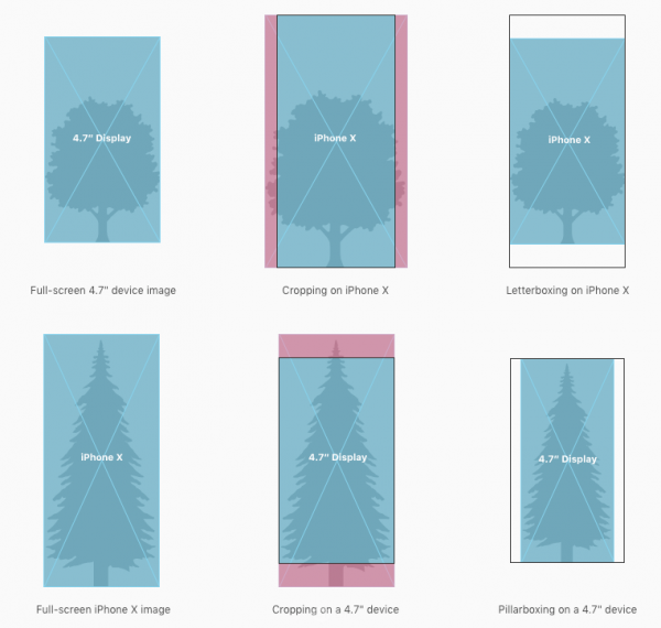 由于iPhone X長出來一截,因此之前全屏比例的圖片在iPhone X上就會變形,如下圖所示,因此開發工程師可能為了適配,將原有的圖片拉大,充滿整個屏幕,如果不拉大,那么就會出現下圖第一排最右邊圖的效果,上下白邊非常難看。另一種情況,你的圖片可能會擠壓變形,那就是第二排圖片的樣子了。