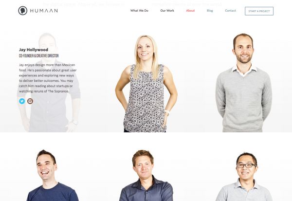 一個好故事并不需要做的太復雜。Humaan 就很直接的借助團隊照片和懸浮動效來講述故事,幫助訪客了解這個團隊的成員。這種設計簡單而有效。(注意懸浮狀態下每個成員姿勢和表情的變化,非常有意思)