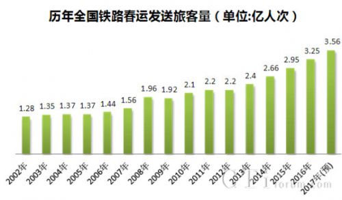 根據中國鐵路總公司的數據顯示,2017年,全國鐵路預計發送旅客3.56億人次,同比增加3156萬人次,增長9.7%。今年鐵路春運可能會成為”史上最難搶票年“。今年的鐵路春運,從1月13日起至2月21日止,共40天。