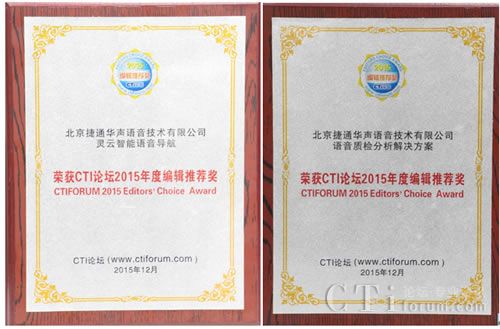 靈云科技22日消息:由CTI論壇主辦的2015年度“編輯推薦獎”頒獎典禮成功舉辦,憑借優質的智能語音交互及大數據平臺,捷通華聲“靈云智能語音導航”及“靈云語音質檢分析解決方案”喜獲CTI論壇2015年度編輯推薦獎。