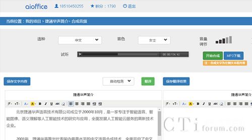 Aioffice中的語音合成功能,可以將大段話由文字轉換為錄音,例如一部長篇小說,可以分成多個章節進行轉寫并命名,方便在不能夠看書的時候聽書;也可以將一長段需要在會議、會場朗讀的文字使用語音合成系統合成;再有超市需要較長的語音播報,可以直接使用Aioffice中的語音合成進行合成。