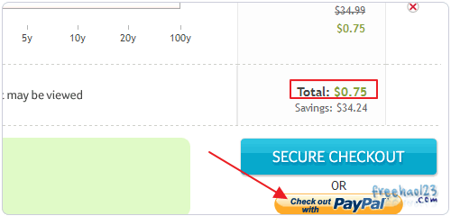 7、確定后,你會發(fā)現(xiàn)使用優(yōu)惠碼后域名的價(jià)格已經(jīng)變成了0.75美元一年了。可以用Paypal付款。