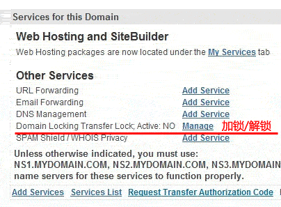點擊本頁面底部的 Domain Locking Transfer Lock; Active: NO 中的 “ Manage”鏈接