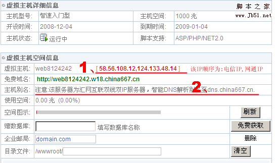 劃紅線的第一條紅線處標記的是虛擬主機所擁有的IP,順序為電信IP,網通IP,解析A記錄時添寫任意一個即可。