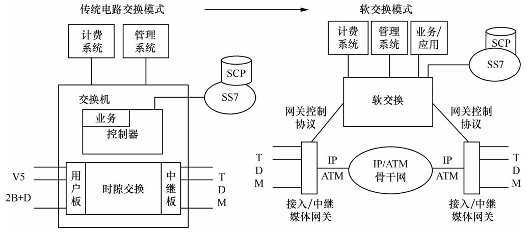 與PSTN交換機不同的是,較交換提供的呼叫控制功能與業務無關,是各種業務的基本控制功能。軟交換只提供控制功能,不提供媒體交換功能。傳統的交換機是基于電路交換技術的,話音通信以64 kbit/s的速率在網絡中傳輸。在交換機的接口處,64 kbit/s的信號流經時分復用后進入高速數字設備。呼叫路由與智能化控制和電路交換網絡緊密地結合在一起。電路交換機最復雜的部分是執行呼叫處理的軟件。它做出呼叫路由的選擇并完成成百上千種處理功能。電路交換機中運行這一軟件的處理器和采用電路交換方式的設備高度集成在一起[3]。而軟交換的主要設計思想是業務/控制與傳送/接入分離,各實體之間通過標準的協議進行連接和通信,以便在網上更加靈活地提供業務。傳統電路交換模式和軟交換模式的構架對比如圖7-2所示。可以看到,傳統交換機的功能被軟交換和接入/中繼/媒體網關所代替,網關把TDM(Time Division Multiplexing,時分復用)流轉換為RTP流,在IP網上傳送。