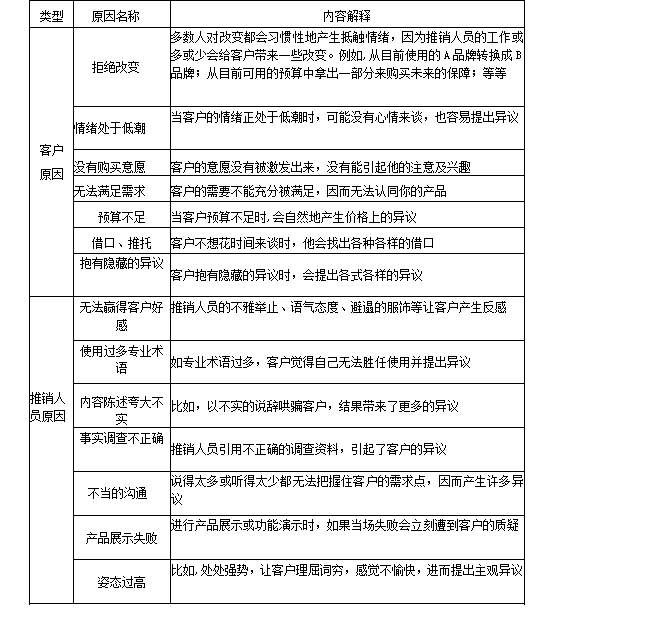 (1)需求異議。需求異議就是指客戶以自己沒有這種產品需求而提出異議。這方面的原因有兩個:第一,真的不需要,可能他已經有了;第二,客戶需要,只是沒決定購買。比如覺得款式太舊,客戶不喜歡(此時 需深層挖掘,找出真正拒絕的原因解決)。