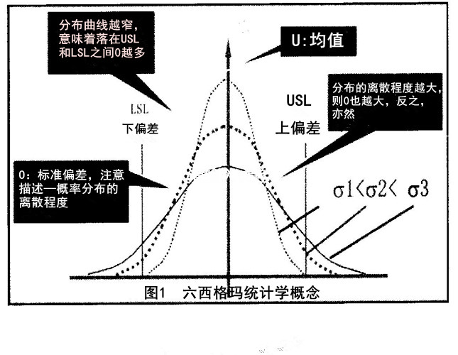 田口玄一博士的質量工程,完整性的克勞士比,追求卓越的湯姆·彼得斯,摩托羅拉的六西格瑪( SIX sigma)都是精益質量管理的代表。六西格瑪意味著每百萬次機會34個缺陷(3.4ppm)。六西格瑪統計學概念如下圖: