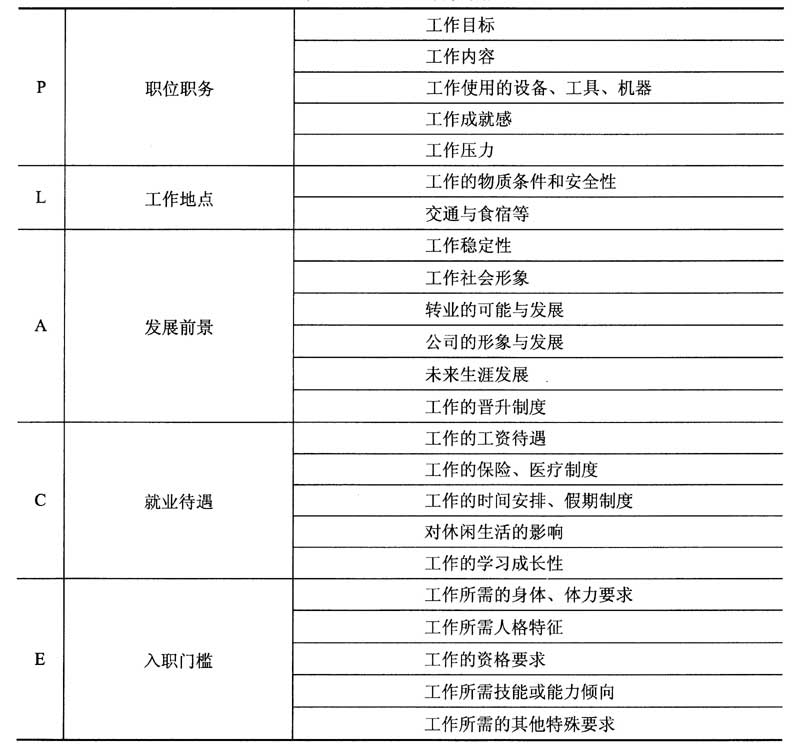 PLACE法名稱中的5個(gè)字母,分別代表了評(píng)估工作的五大層面指標(biāo),它們分別是:職位職務(wù) Position);:工作地點(diǎn)( Location):發(fā)展前景( Advancemen;就業(yè)待遇( onditionof Employment);:入職門檻( Entry Requirements)。各項(xiàng)具體指標(biāo)內(nèi)容如表所示