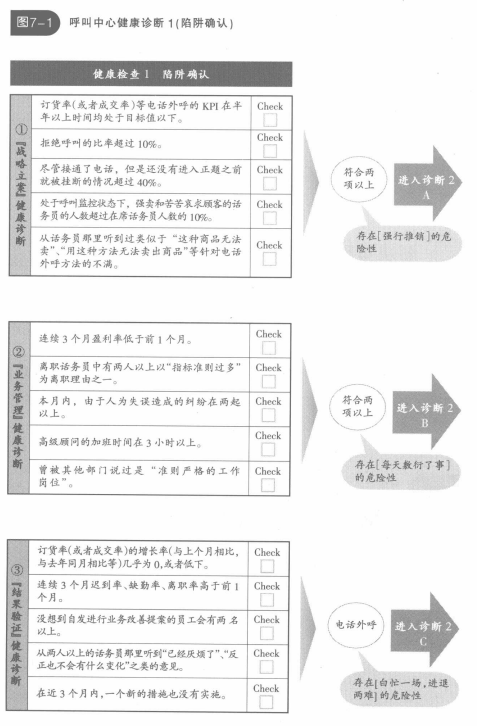 呼叫中心,它的各種指標、電話現場的主管,以及話務員的行動中,都會露出問題的端倪。圖7-1中的問題項目,是對落入陷阱的顯著癥狀的一個總結。