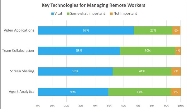 事實上,三分之二的公司表示,視頻應用程序對于遠程管理至關重要;沒有它們,一旦疫情消退,它們就無法繼續(xù)遠程工作。視頻是關鍵,因為它通過能夠看到彼此來提供管理中的個人接觸,但一些公司也使用它來指導使用視頻與客戶溝通的座席。
