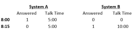 同一呼叫,兩個不同的系統,一天結束時的總體數據將是相同的--但是,間隔數據的劃分方式不同,并且當系統B將所有呼叫數據放入跨越該間隔的下一個呼叫間隔中時,對您整個WFM應用程序和人員配置的影響,尤其是在開始的幾個時間間隔內。如果要使用系統B,則可能需要相應地調整計劃。