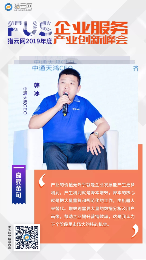 韓冰指出產業的價值就是企業發展能產生更多利潤。產生利潤就是降本增效,降本的核心就是把大量重復和規范化的工作,有機器人來替代。增效則需要大量的數據分析及用戶畫像,幫助企業提升營銷效率。下個階段,市場的核心機會就是降本增效。下一個巨大的商機在于打通所有系統,以數據化為企業核心驅動力,幫助企業和用戶做更好的服務。