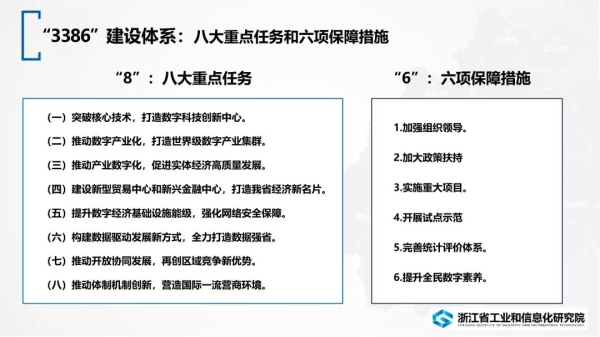 浙江省這20年來一直在引領中國經濟,按照數字化、網絡化、智能化的發展路徑探索。頂層設計概括起來就是這兩個文件:《浙江省國家數字經濟示范省建設方案》和《浙江省數字經濟五年倍增計劃》。核心內容講什么?3386建設體系。