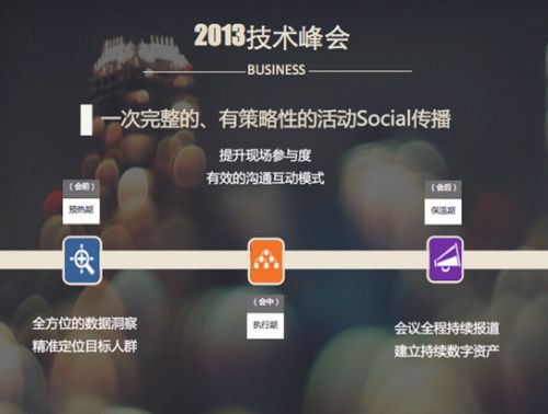 這家企業利用social touch 完整的社會化活動管理解決方案,在活動前期可以全方位的通過數據洞察來定位目標人群以及關鍵意見領袖,進行有針對性的邀請。通過活動管理后臺設定活動主題、相關嘉賓的演講內容和會議流程,并通過HTML5頁面進行展示。并利用微博、微信以及官網等平臺,向目標人群進行推廣報名。不同渠道的報名人員的信息統一匯總到后臺的系統當中。