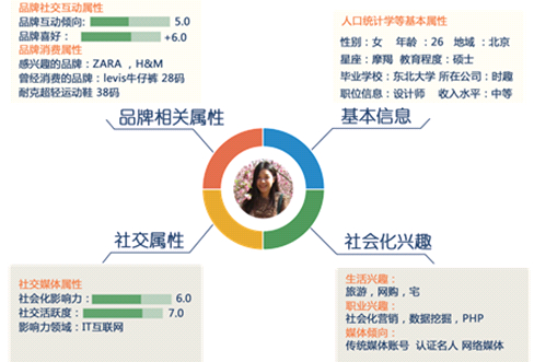 管理我們的每一個受眾,首先就是要對我們的受眾進行描述,包括他的基本信息,比如性別、年齡、地域、星座等人文統計學的信息,以及畢業學校、教育信息、職位、收入水平等,或者是他的社會化的興趣、生活興趣、社會興趣、媒體傾向等。由于每一個人都有他的自媒體屬性,所以我們要對每一個人都有一個社會化的描述,包括他的社會化影響力和社交活躍度。當消費者與品牌產生了關聯之后,我們還會對他的品牌的喜好程度、以及感興趣的品牌和曾經消費過的品牌進行多維度的補充。