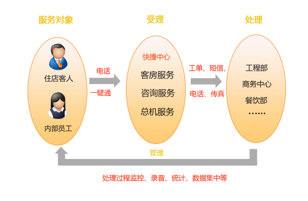 - 能夠實現對外統一號碼服務:酒店對外對內可以只保留一個服務號碼,客人所有的服務請求都撥打這個號碼。客人可直接按話機上的快捷中心按鈕,自動呼叫至快捷中心。