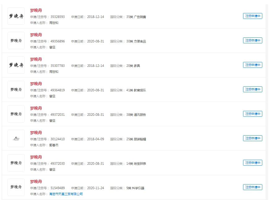 蹭名就要腦洞大,前邊換字文章做完了,還有加字的“文章”!晚舟早歸、晚舟歸來、巾幗晚舟商標均有注冊申請。
