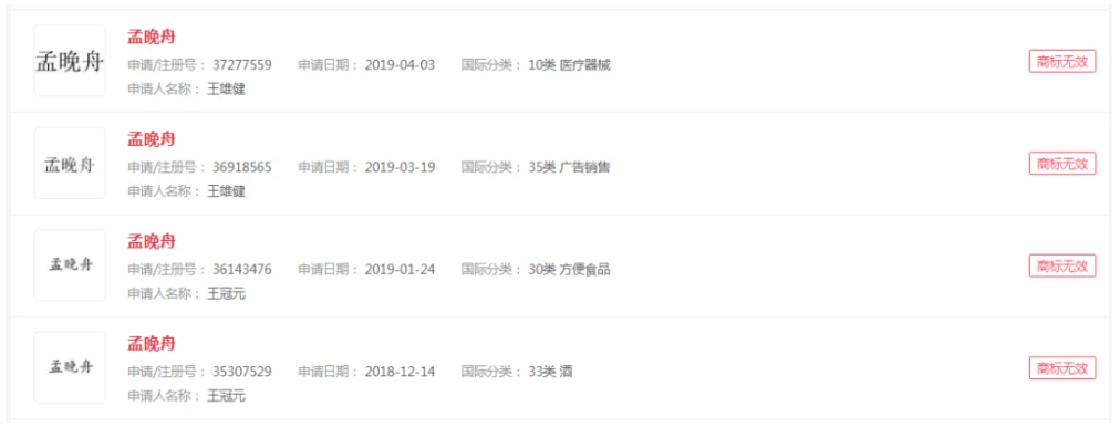 查詢企查查信息顯示,從2018年12月14日開始,第一個“孟晚舟”商標被人搶注商標,到目前為止一共4個“孟晚舟”商標申請信息。目前這些商標都處于“商標無效”狀態!