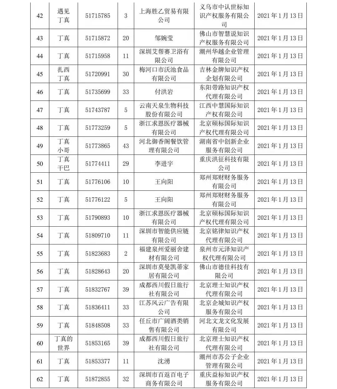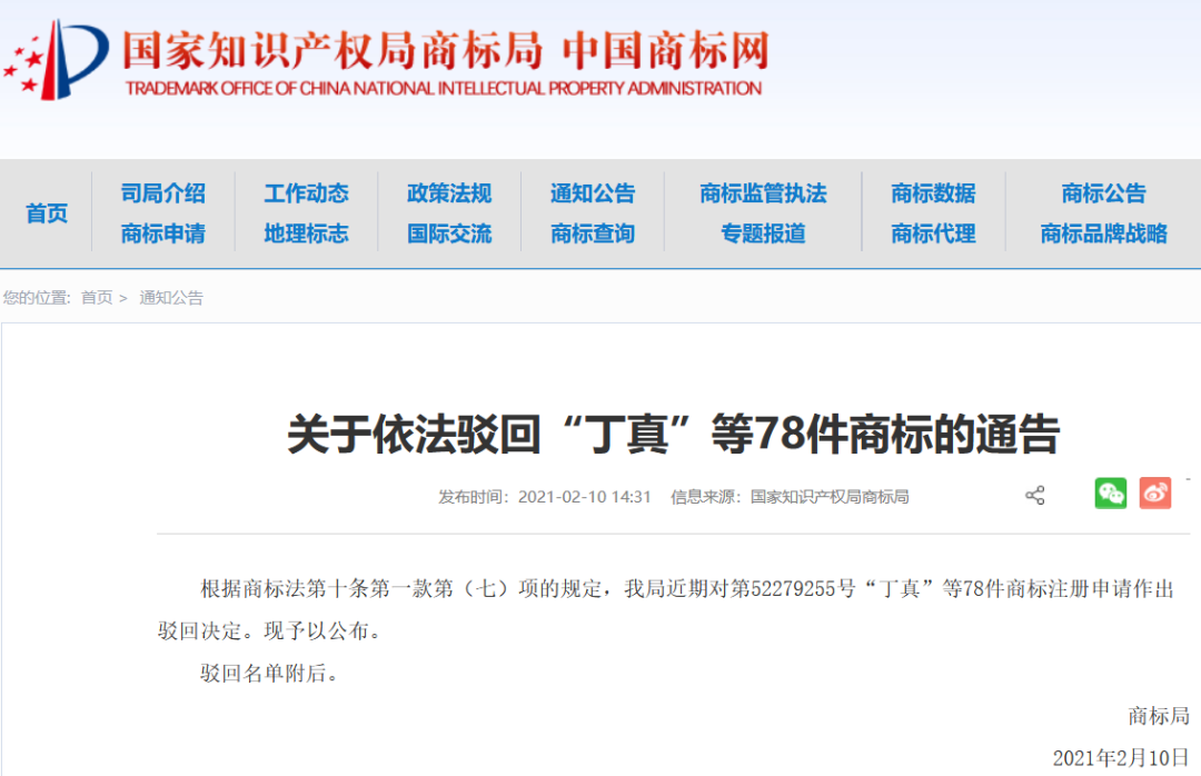 根據商標法第四條第一款、第十條第一款第(七)項的規定,我局近期對第51763155號等13件“丁真”商標注冊申請作出駁回決定。現予以公布。
