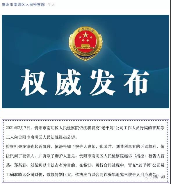 2021年2月7日,貴陽市南明區人民檢察院依法將冒充“老干媽”公司工作人員行騙的曹某等三人向貴陽市南明區人民法院提起公訴。