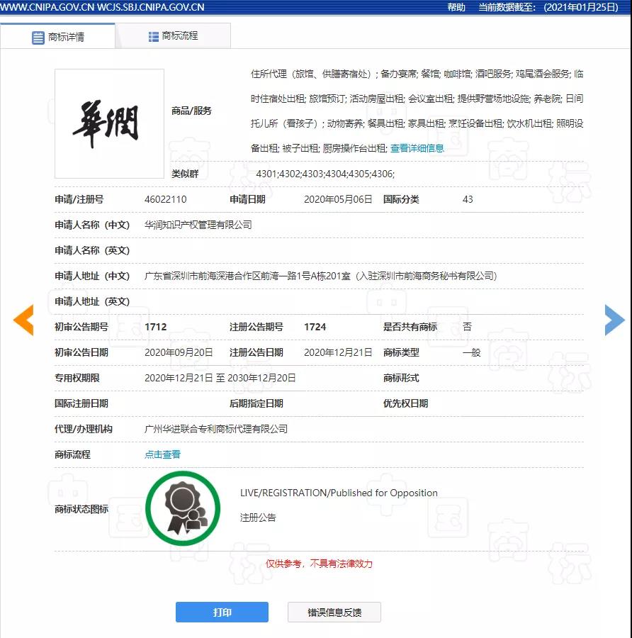 華潤公司享有第773121號商標的注冊商標專用權,該商標于1994年12月7日獲準注冊,核定使用在第36類資本投資、不動產管理等服務上,經續展商標專用權有效期至2024年12月6日。