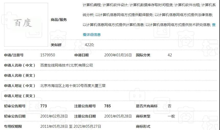 迄今為止,百度已經(jīng)在多個(gè)類別上注冊(cè)了一系列“百度”、“baidu”等商標(biāo)。