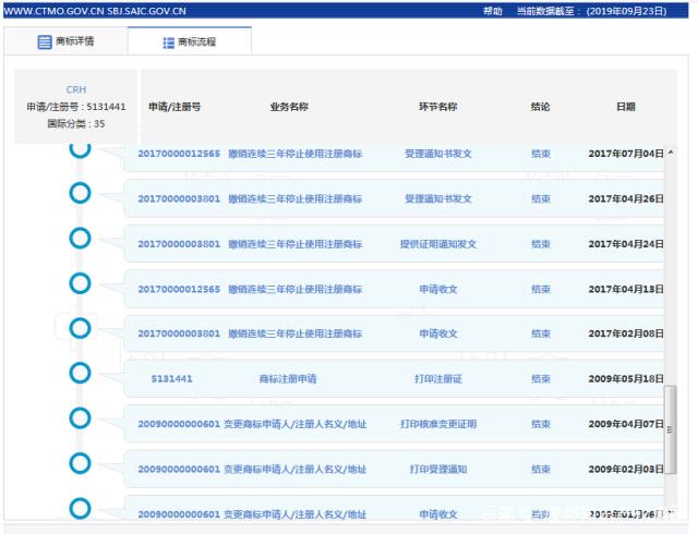 該商標于2006年1月20日申請注冊,2009年4月28日獲準注冊,核定使用在“廣告; 市場研究; 拍賣; 人員招收; 文字處理; 簿記; 商業管理輔助; 組織技術展覽; 進出口代理; 推銷(替他人)”第35類服務上,經過續展,注冊商標專用期限至2029年4月27日。