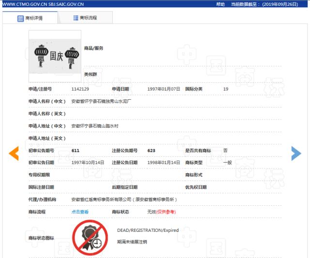 第二件國(guó)慶商標(biāo)使用商品為水泥,但由于有效期滿(mǎn),注冊(cè)人沒(méi)有辦理續(xù)展,該商標(biāo)已經(jīng)失效。
