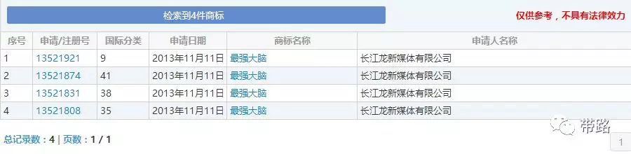 從商標局官網查詢到的結果顯示,顯示在長江龍公司名下的“最強大腦”商標有4件,類別分別是第9類、35類、38類和41類上,申請時間都在2013年11月11日。